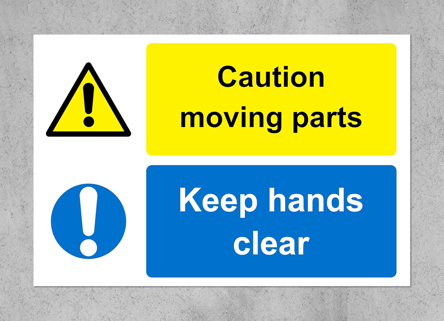 Caution moving parts keep hands clear safety sign - Self adhesive sticker 150mm x 100mm
