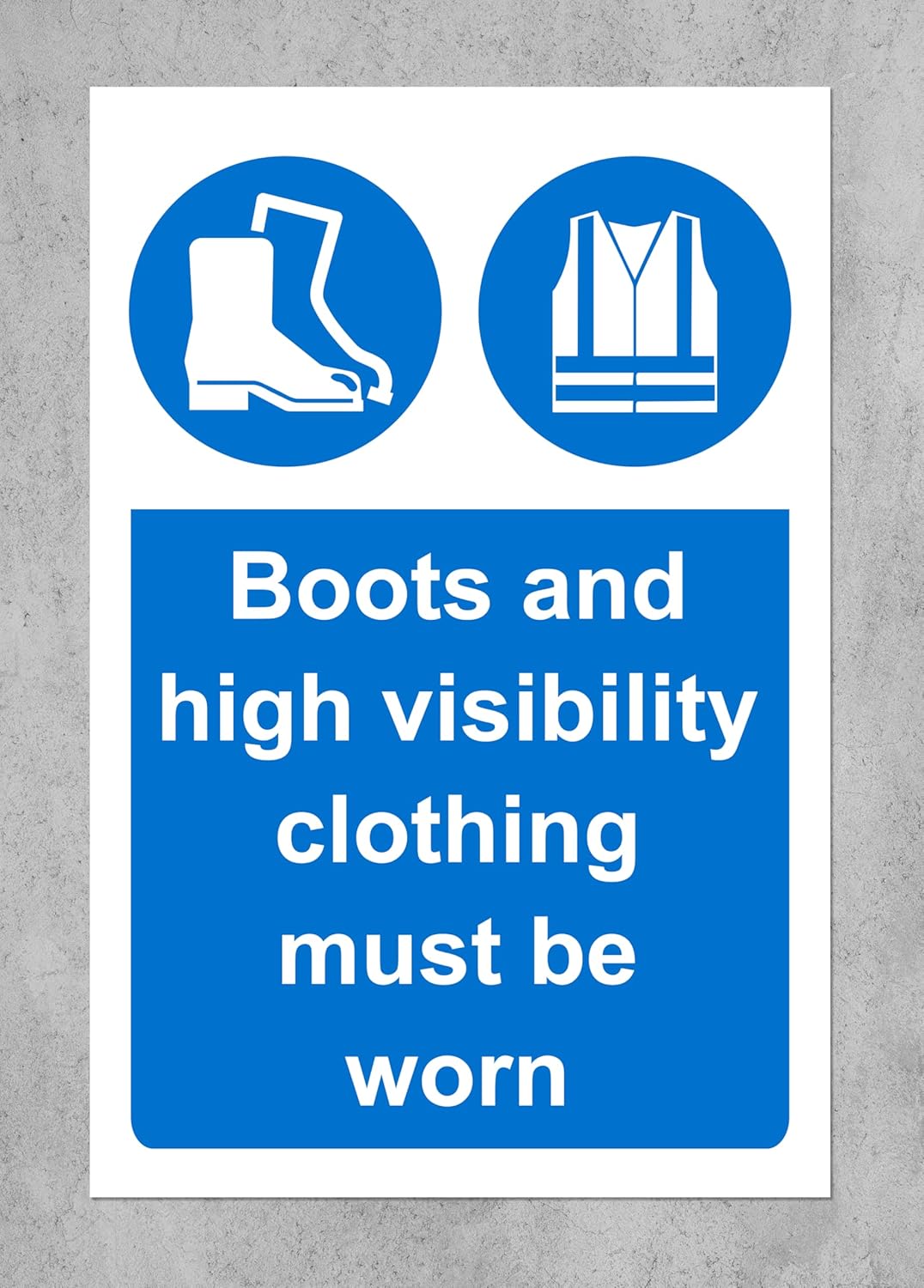 Boots and high visibility clothing must be worn Construction safety sign - Self adhesive sticker 200mm x 150mm