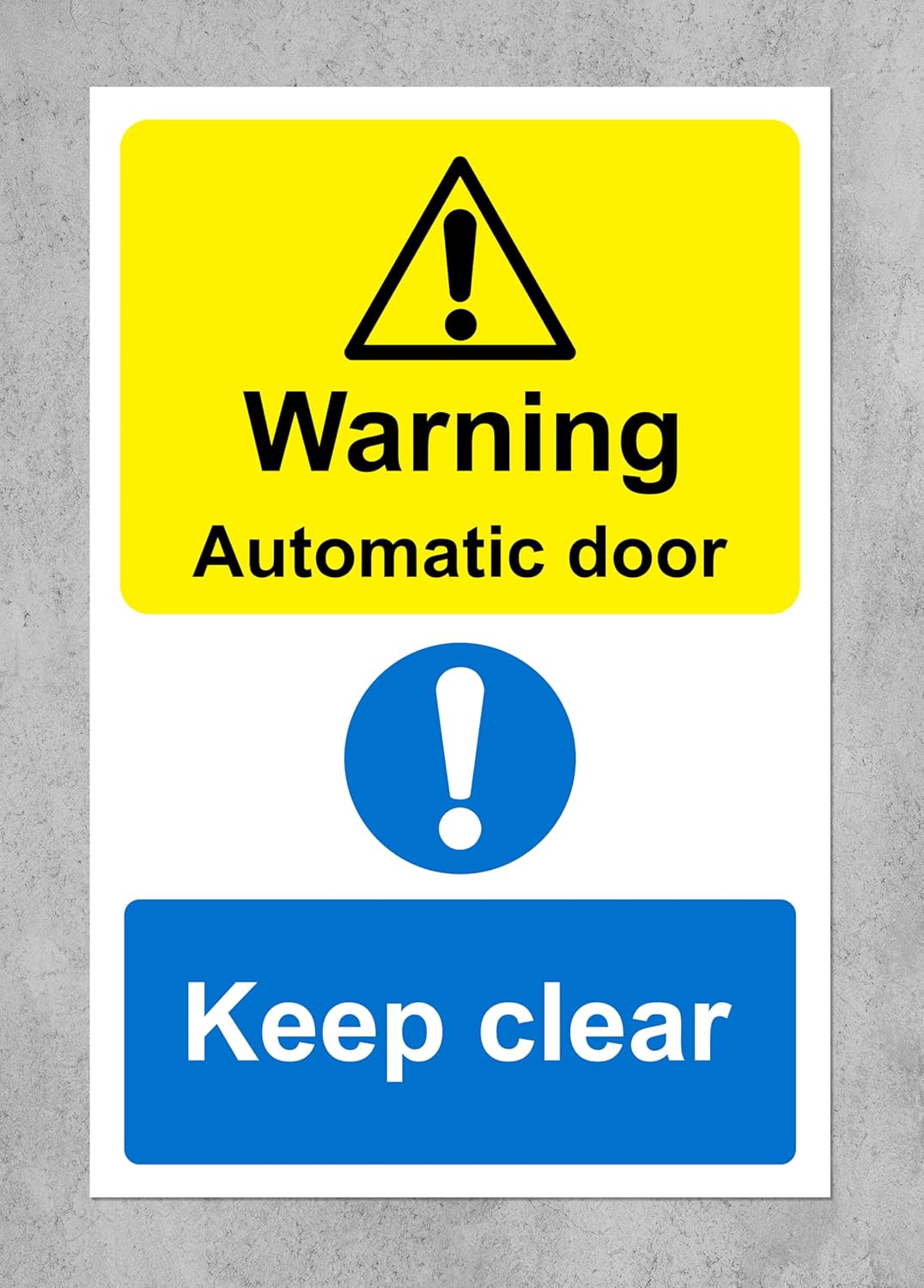 Warning automatic door keep clear Safety sign (BY) - Self adhesive sticker (150mm x 100mm)