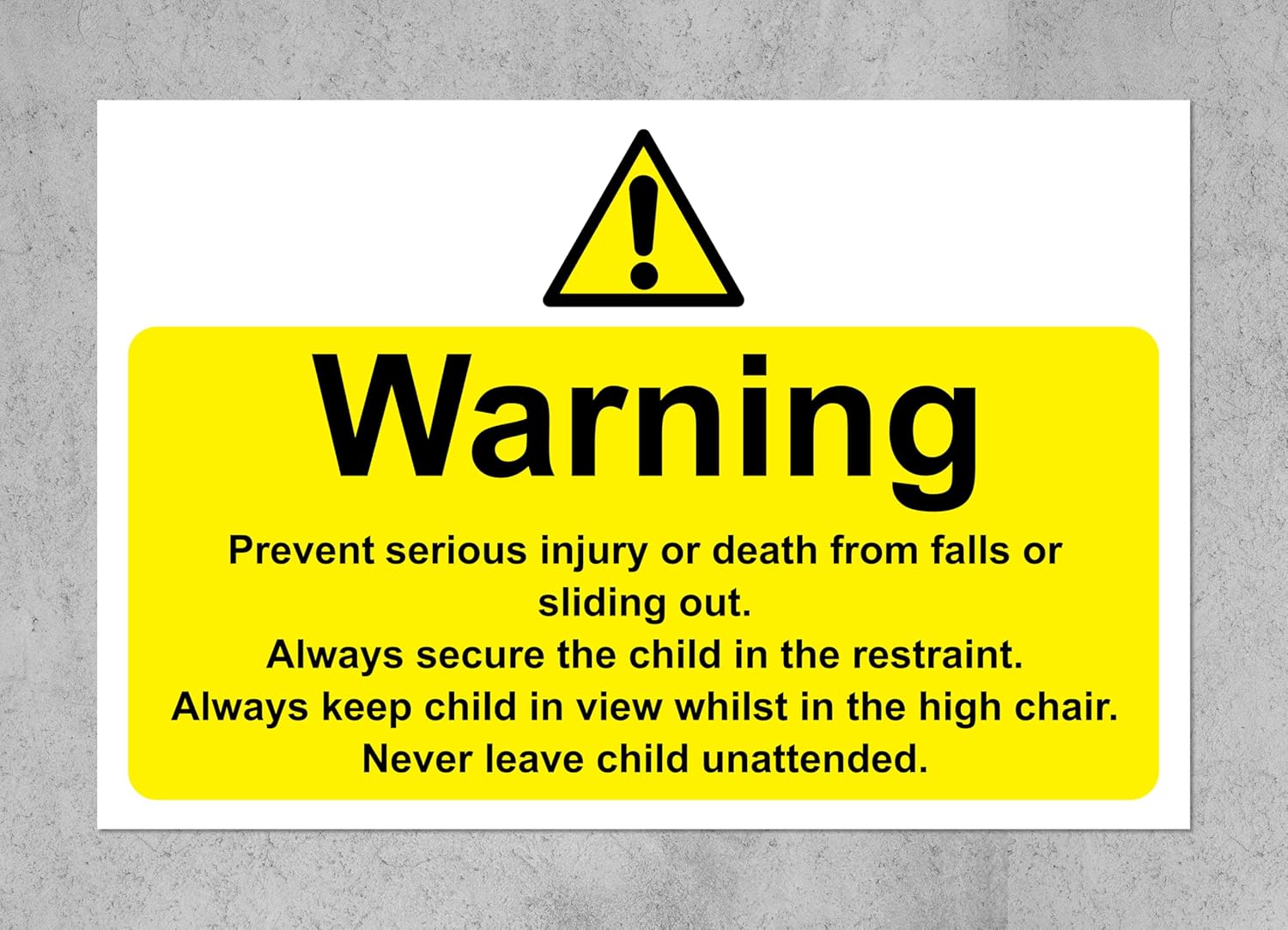 Warning high chair safety sign - Self adhesive sticker (150mm x 100mm)